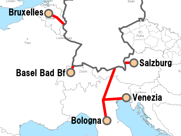●Munchen – Bologna(イタリア):ユーロシティブレンナー機材とOBBレイルジェットのみ